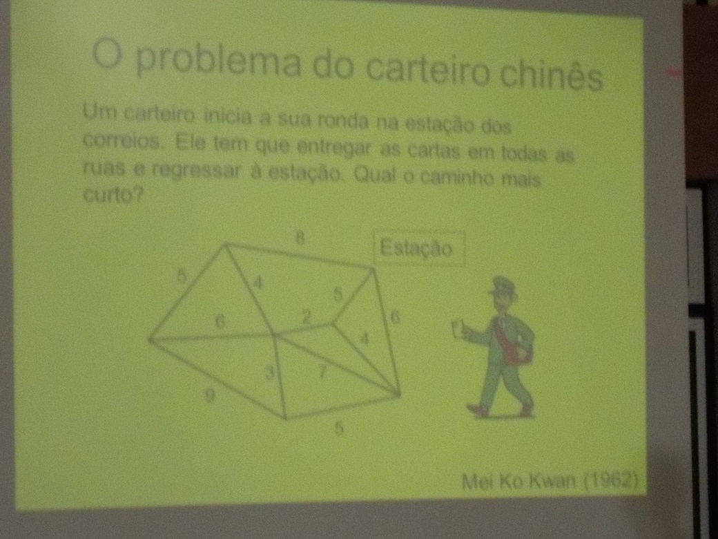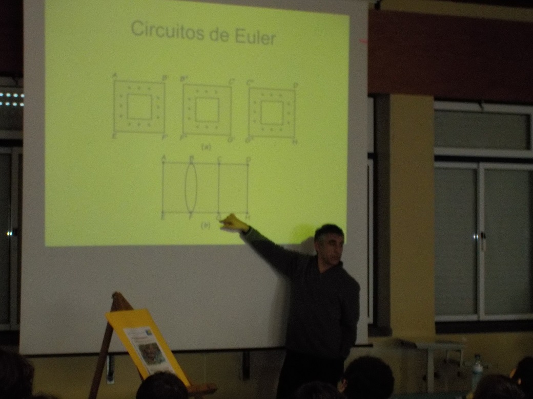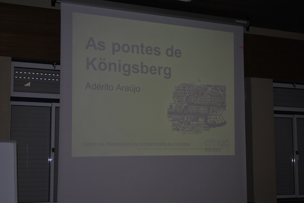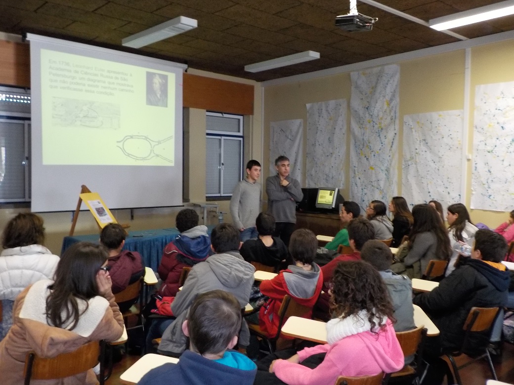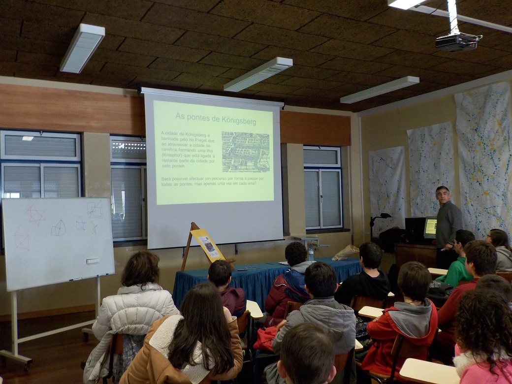 No dia 21 de janeiro, cento e dez alunos do 8º e do 9ºano da Escola Básica 2/3 Infante D. Pedro, assistiram à palestra “As pontes de Königsberg”, proferida pelo Professor Doutor Adérito Araújo, do Departamento de Matemática da Universidade de Coimbra, no âmbito do Projeto “Tardes de Matemática”, promovido pela SPM (Sociedade Portuguesa de Matemática). O famoso problema histórico das sete pontes, apresentado pelo palestrante, foi o ponto de partida para uma empolgante digressão pela Teoria dos Grafos e para o papel preponderante do matemático Leonhard Euler. Ao longo da sessão, o orador imprimiu uma dinâmica empolgante, que fomentou intervenções entusiásticas dos alunos, constituindo um verdadeiro sucesso pelas vivências Matemáticas proporcionadas.