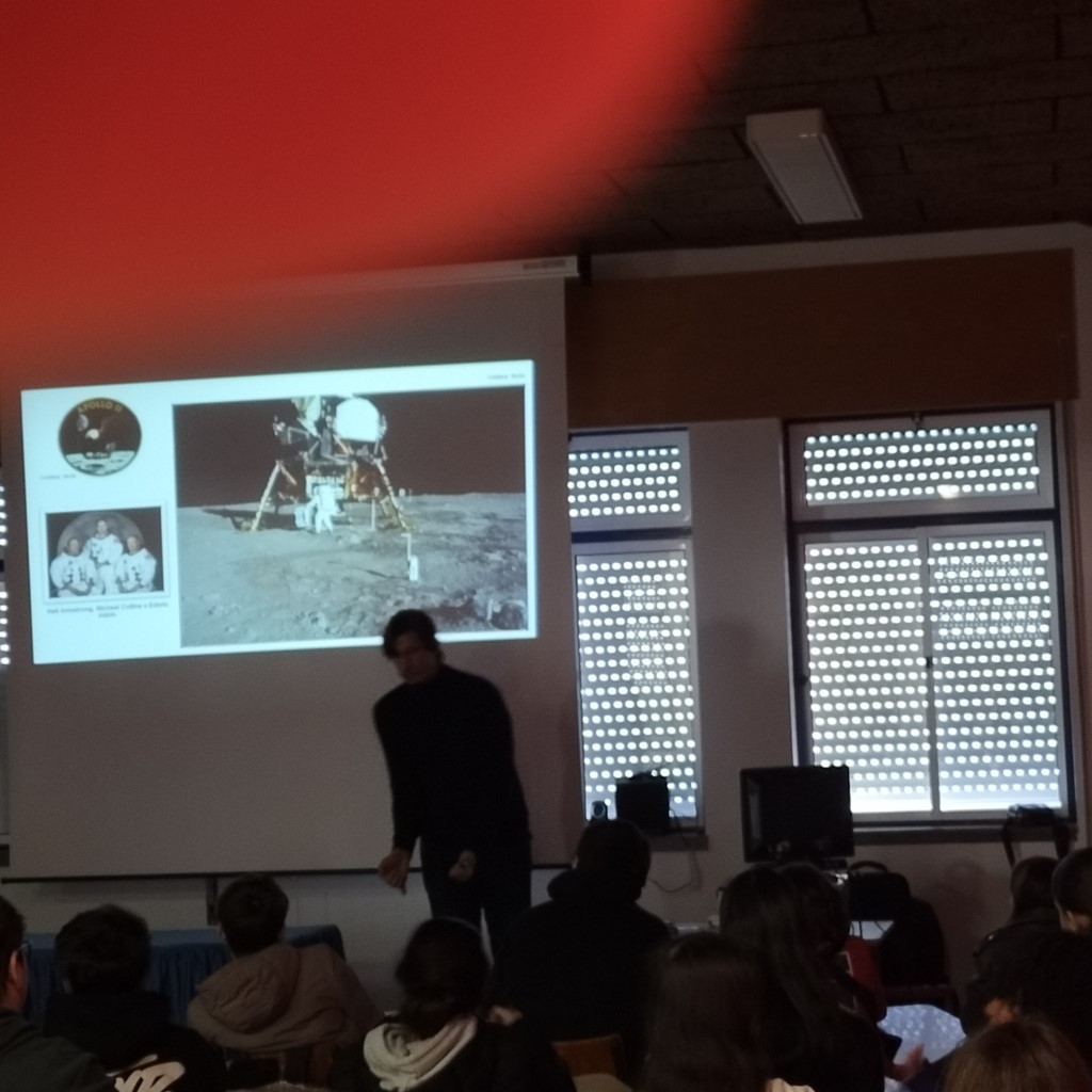 Durante uma hora foi desenvolvida uma notável exposição de todo o percurso que levou o Homem à Lua, tendo abordado a rivalidade da ex-União Soviética com os Estados Unidos da América, sobre quem chegaria em primeiro lugar à Lua. Fez o relato de algumas situações perigosas ocorridas na primeira saída para o espaço. Foram indicadas quais as profissões mais apreciadas nos candidatos a astronautas (engenheiros, físicos, matemáticos, …). Foram apresentados factos que desmistificam a ideia de que o homem não esteve na Lua, pelo facto de não existirem fotografias de Neil Armstrong na Lua. Foram colocados no espaço lunar refletores, o que prova a presença humana na Lua. O prof. Rui Curado referiu que os Portugueses podem candidatar-se a astronautas, tanto os homens como as mulheres.